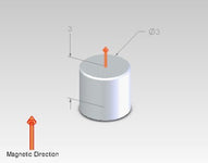 This Neodymium cylinder magnet weighs 1.5 grams and has a pull force of 285 grams. Gauss 6123, Grade N45. It is 3mm in height and 3mm in diameter and its direction of magnetisation is through height.