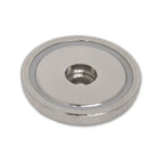 This heavy duty Neodymium Pot Magnet has a round hole centre and a strong pull force of 32kgs. It has an outside diameter of 42mm and a thickness of 9mm. The product consists of a metal cup housing a Neodymium Rare Earth magnet and has a straight sided hole in the centre.
